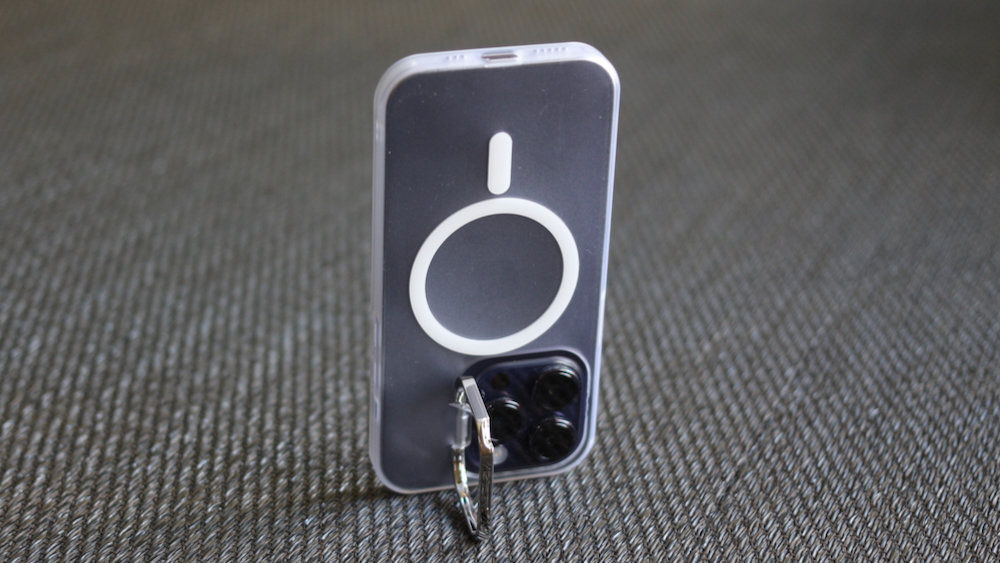 Jowua 自帶支架 MagSafe 透明手機殼的開孔位置都很精準,在手機殼的四個邊角有做防撞氣囊,還有一個吊飾掛繩孔。