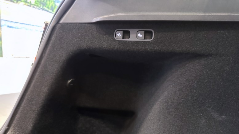 Model Y Long Range 和 Model Y Performance 車尾箱都有一個行李箱隔板,可以 Z 字形開啟或關閉;後尾箱有二個電動放倒後排座椅的開關,下面還有一個 12V 點煙器接頭。